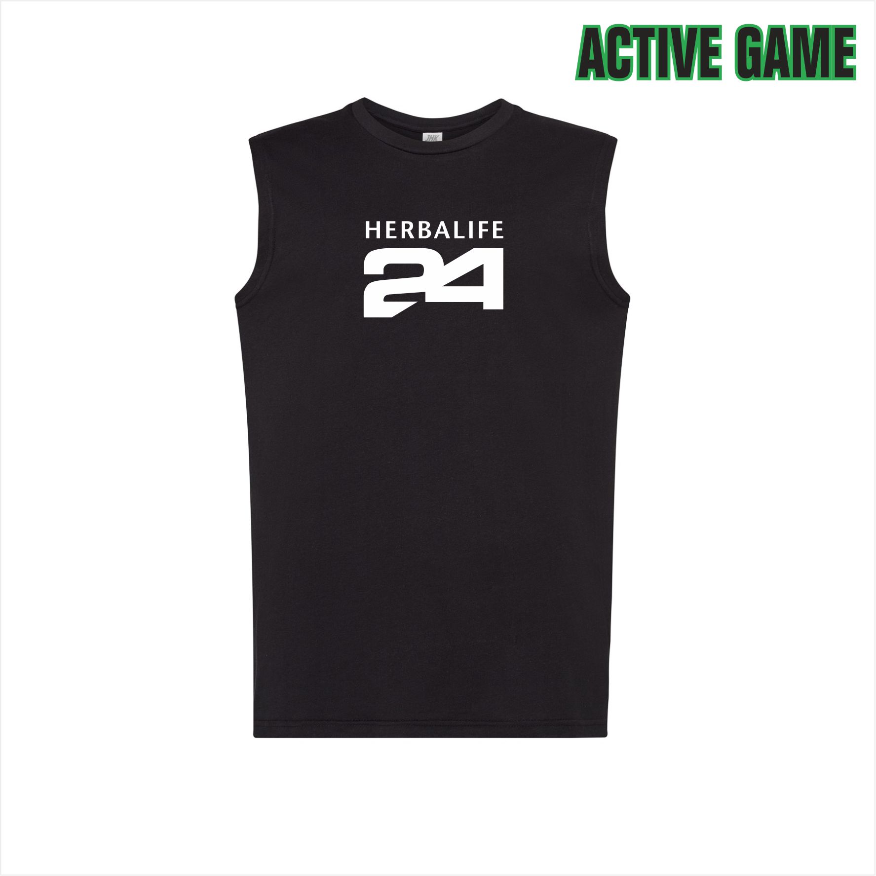 - Czarny T-shirt męski bez rękawów z białym logo Herbalife 24 z przodu